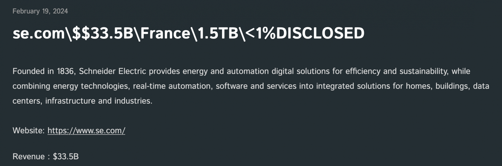 Доходы Schneider Electric в 2023 году, согласно заявлению самой компании, составили 28,5 миллиарда долларов. Интересно, что не так давно системы техногиганта также пробили операторы другого шифровальщика — Clop.
