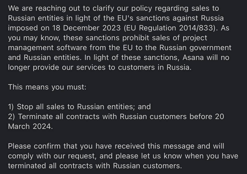 «Наши партнеры в лице компании Asana вчера уведомили нас, что в связи с запуском последнего пакета санкций ЕС они не могут продолжить предоставлять подписку сервиса для компаний, штаб-квартира которых располагается на территории Российской Федерации, — гласит сообщение Rocket в тематическом телеграм-канале. — Ограничения стартуют 20 марта 2024».