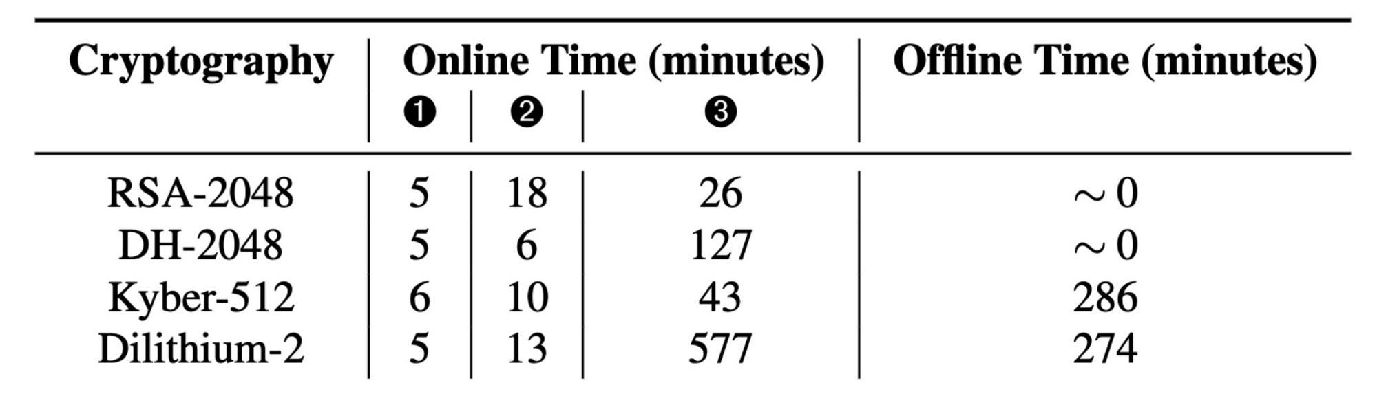 2048-битный ключа RSA новый метод может извлечь менее чем за час, а с 2048-битным ключом Диффи-Хеллмана придётся повозиться дольше — чуть более двух часов.