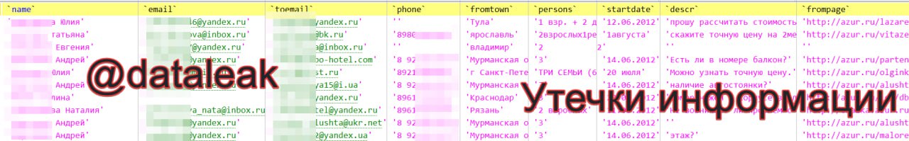 Очередная утечка, и на этот раз в общий доступ попали данных граждан, бронировавших отели через туристический веб-ресурс azur[.]ru. Информация достаточно свежая — датируется текущим месяцем.