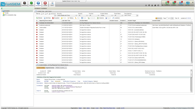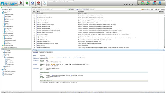 FortiSIEM постоянно отслеживает инфраструктуру и предоставляет информацию, которую можно использовать для анализа производительности, доступности и безопасности. Для оперативного реагирования на события безопасности необходимо своевременно получать предупреждения о возникновении исключительных, подозрительных или потенциальных неисправностей и нарушений. Для этого используются правила, определяющие условия, на которые следует обратить внимание и которые инициируют инцидент. FortiSIEM включает в себя более 500 системных правил, а также редактор для генерации собственных правил.